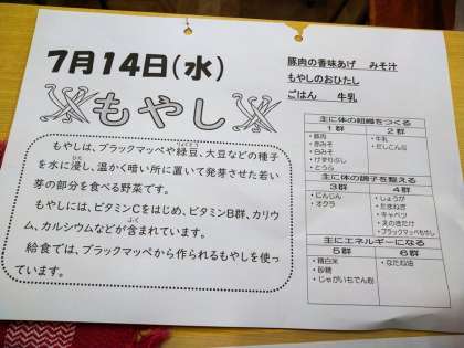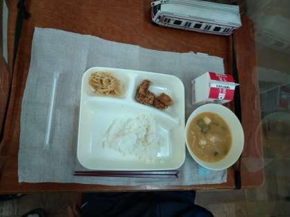 本日は、豚肉の香味あげ、みそ汁、もやしのおひたし、ごはん、牛乳でした。