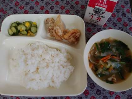 ☆給食室よりこんにちは☆ 7月19日(月)〜鶏肉のから揚げ、中華みそスープ、きゅうりとコーンの甘酢あえ、ご飯、牛乳〜