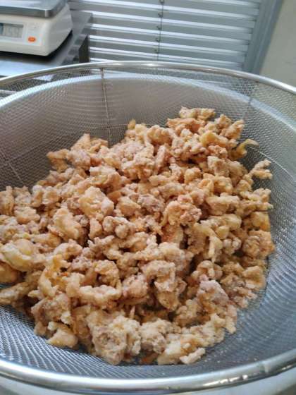 今日は皆さんの好きな唐揚げです。下味をつけた鶏肉にでん粉をまぶして、油の入った釜にていねいに投入します。“ジュワー!”というおいしそうな音と共に、良いにおいが立ち込めます。今日は2基の揚げ釜を使用しましたが、釜の近くでは40度を超えました。