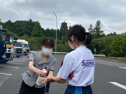 トイレ休憩を取りました。バス乗車時には、毎回消毒を行います。