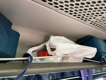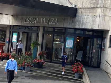 エスカルプラザで、土産購入中です。感染症対策のため、分散して店に入っています。購入した人からバスに戻り、網棚に置いています。