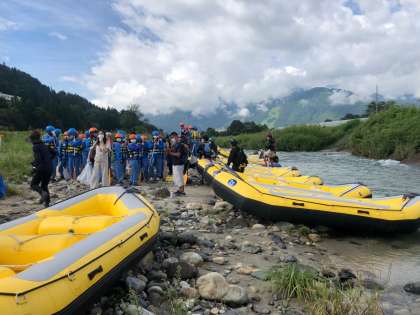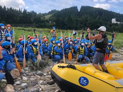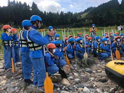学級写真を撮り、インストラクターから説明を受けています。これが終わると、ボートに乗り込んでラフティング開始です!