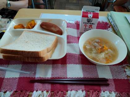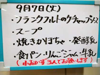 本日は、フランクフルトのケチャップソース、スープ、焼きかぼちゃ、 発酵乳、食パン、りんごジャム、牛乳でした。
