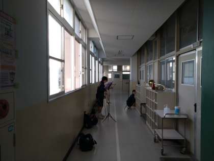 吹奏楽部は、校内で人との距離を取りながら練習に励んでいます。