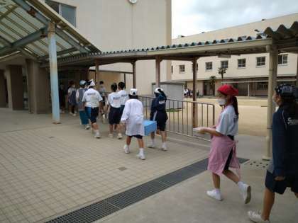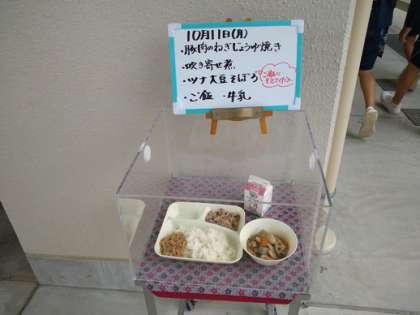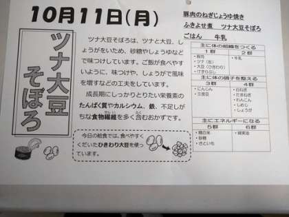 本日は、豚肉のねぎじょうゆ焼き、ふきよせ煮、ツナ大豆そぼろ、ごはん、牛乳でした。