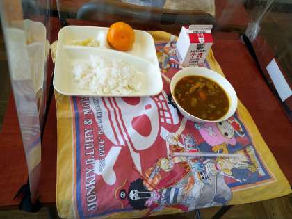本日は、ポークカレー【米粉】、キャベツのピクルス、みかん、牛乳でした。