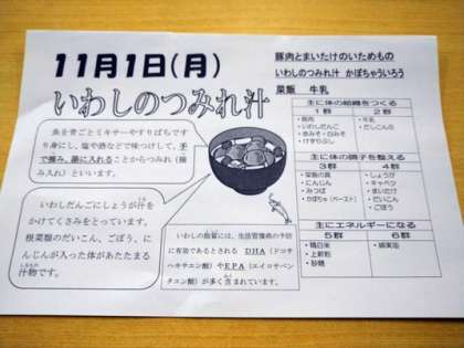 いわしだんごにしょうが汁をかけてくさみを取っています。根菜類のだいこん、ごぼう、にんじんが入った体があたたまる汁物です。