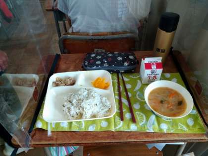 本日は、豚肉とまいたけのいためもの、いわしのつみれ汁、かぼちゃういろう、葉飯、牛乳でした。