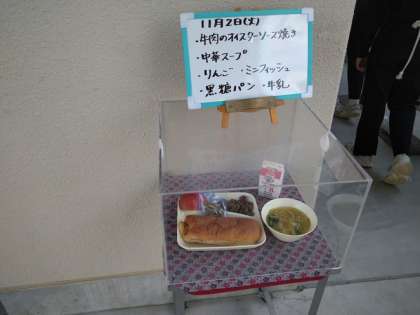 本日は、牛肉のオイスターソース焼き、中華スープ、りんご、ミニフィッシュ、黒糖コッペパン、牛乳でした。