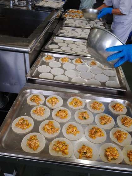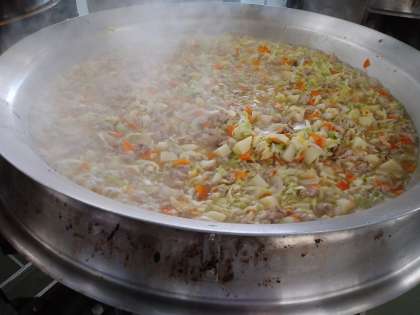今日の献立は、豚肉と野菜のスープ煮、変わりピザ、みかん、レーズンパン、牛乳です。皆さん、お味はいかがでしたか?