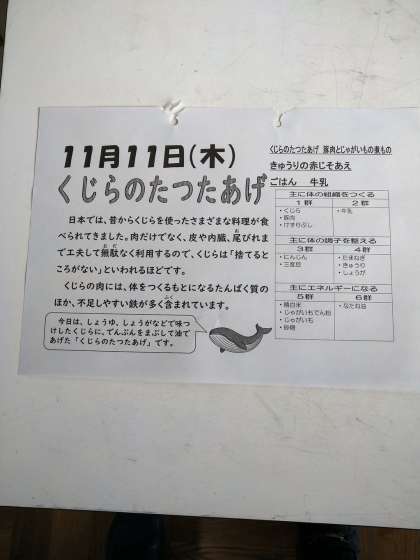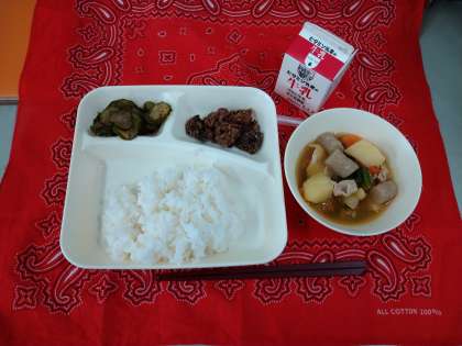 本日の給食のメニューば、くじらの竜田揚げ、豚肉とじゃがいもの煮もの、きゅうりの赤じそあえ、ごはん、牛乳でした。
