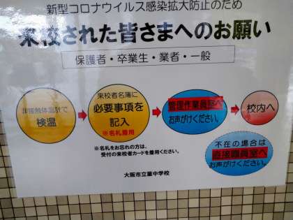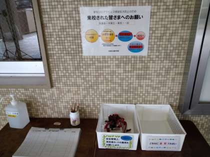 本校では、正門の所に非接触型の体温計を設置しております。来校された方は、検温と消毒にご協力お願いいたします。