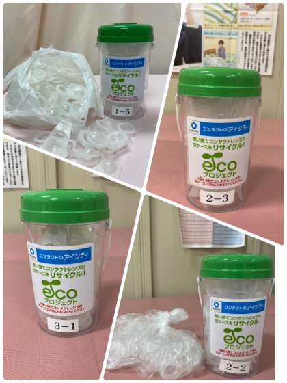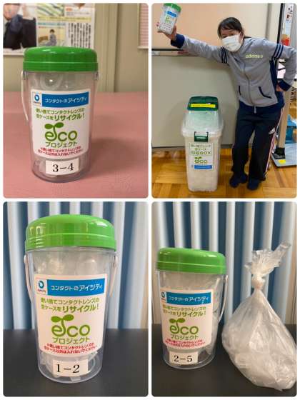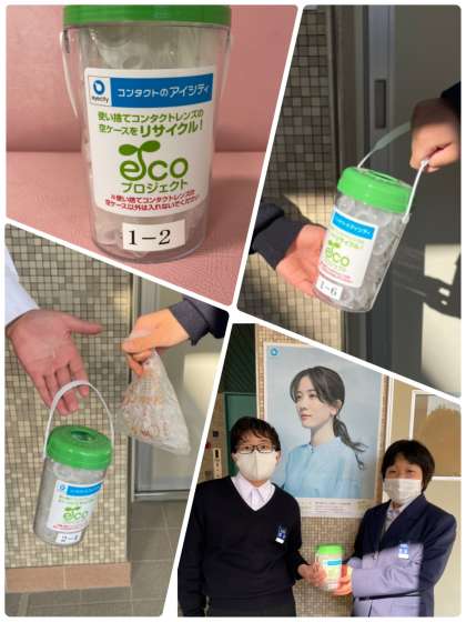 1年2組、1年5組、1年6組、2年2組、2年3組、2年4組、2年5組、3年1組、3年4組の保健委員さんがコンタクトレンズの空きケースを持ってきてくれました!そして、さざなみ学級の先生方の回収ボトルもいっぱいになりました!