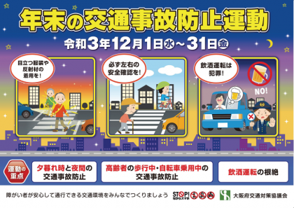 今回の交通事故防止運動の目的は、年末にかけて交通事故が多発する傾向にあることから、広く府民のみなさんに交通安全思想の普及・浸透を図り、交通ルールの遵守と正しい交通マナーの実践を習慣付けることによって、交通事故防止の徹底を図ることとしております。