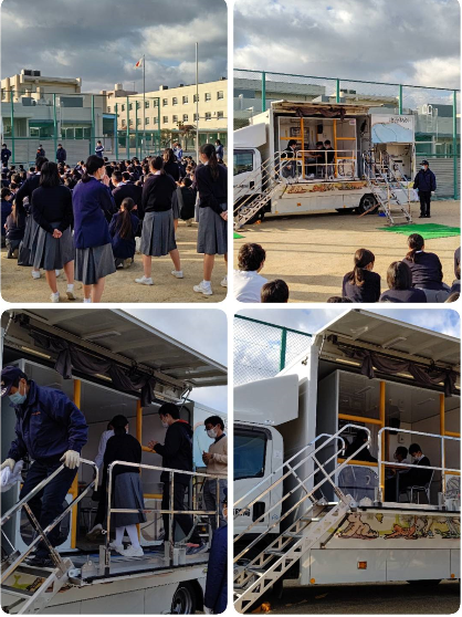 2年生は「起震車」による地震体験を実施いたしました。代表生徒が起震車の体験をし、震度7は座ってもいられないほどの揺れでした。