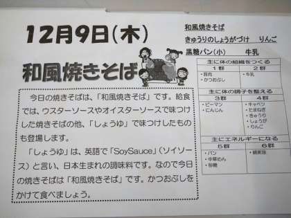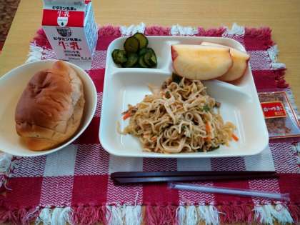 本日は、和風焼きそば、キュウリのしょうがづけ、りんご、黒糖パン(小)、牛乳でした。給食では、ウスターソースやオイスターソースで味付けした焼きそばの他、「しょうゆ」で味付けしたものも登場します。今日の焼きそばは、しょうゆで味付けをした「和風やきそば」でした。かつおぶしをかけて食べました。