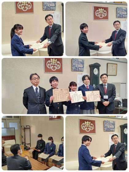 本日、校長室において、「税の作文」で入賞した3名の人たちに、税務署長から直接表彰をしていただきました。受賞おめでとうございます!!
