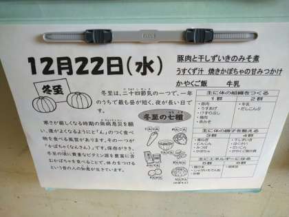 寒さが厳しくなる時期の無病息災を願い、運がよくなるうようにと「ん」のつく食べ物を食べる風習があります。その一つが「かぼちゃ(なんきん)」です。保存がきき、冬至の頃に貴重なビタミン源を豊富に含むかぼちゃを食べることで、体力をつけるという昔の人の知恵が生きています。