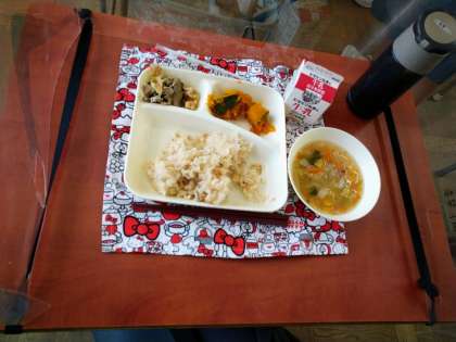 本日は、豚肉と干しずいきのみそ煮、うすくず汁、焼きかぼちゃの甘みつかけ、かやくご飯、牛乳でした。