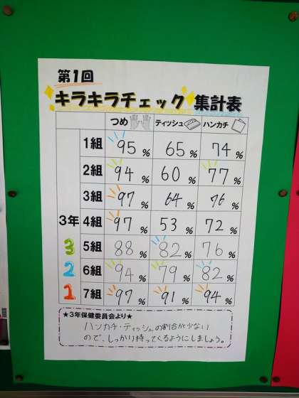 活動を終えての保健委員の見解は、ハンカチ・ティッシュの持参の割合を増やそう!でした。ツメはきちんと切れている人が多いようです。100%目指しましょう。