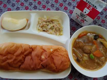 ☆給食室からこんにちは☆ 1月14日(金)〜ミートボールと野菜のカレー煮、ツナとキャベツのソテー、りんご、おさつパン、牛乳〜
