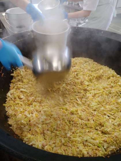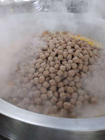 年明け、久しぶりに活気が戻った給食室では、カレーのにおいでいっぱいになりました。きょうはミートボールが入ったカレー味の煮物です。玉ねぎ、だいこん、にんじんをサラダ油でいため、湯を加えて煮込みます。そこへ大量のミートボールが入ります。思わず「おお〜!」と声が出てしまいました。カレールウとチキンブイヨンで味付けし、しめじ、むき枝豆で仕上げます。他にはツナとキャベツのソテー、りんごの組み合わせでした。