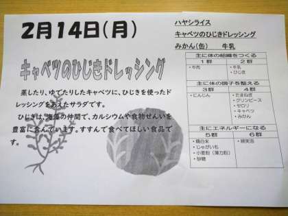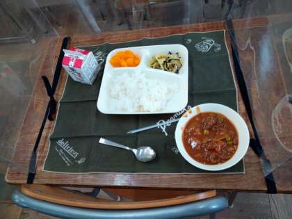 今日のメニューは、ハヤシライス、キャベツのひじきドレッシング、みかん(缶)、牛乳でした。ハヤシライスには、星形の「ラッキーにんじん」が入っていました。