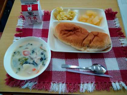 本日の給食のメニューは、ほうれん草のクリームシチュー、キャベツのサラダ、洋なし(カット缶)、おさつパン、牛乳でした。