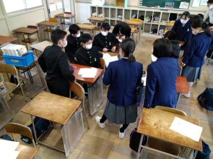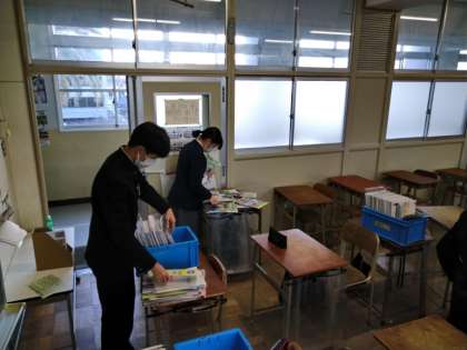 本日の放課後に、学級委員長会を行いました。今日は、先日、後輩のみなさんからプレゼントされたキーホルダーのお礼についての話し合いを行いました。また、2年生に渡す「高校パンフレット」の整理もしました。