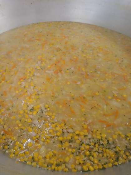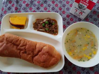 これとコーンスープ、レーズンパン、牛乳の組み合わせです。