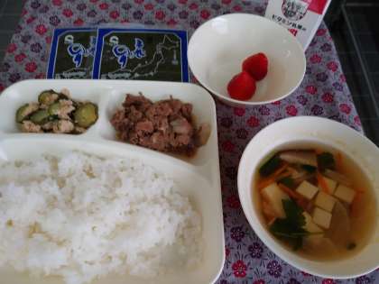 今日は卒業祝い献立で、「手巻きご飯、すまし汁、いちご、牛乳」です。手巻きのりを1人2袋使い、2種類の具をご飯にのせて手巻きにして食べます。普段とは少し違った食べ方で、楽しんでくださいね。