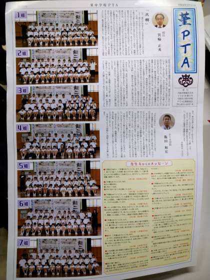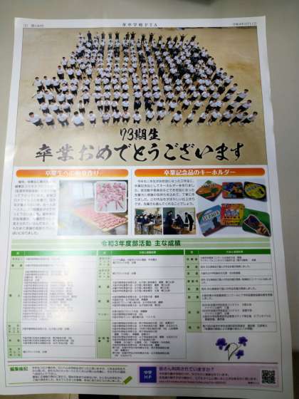 先週の卒業式前にPTA新聞を発行していただきました。各クラスの笑顔溢れる写真や卒業記念品の紹介がありました。