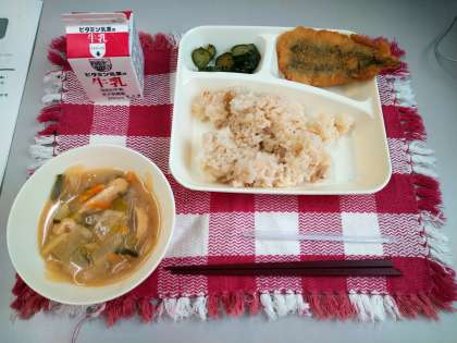 本日の給食メニューは、かやくごはん、いわしのフライ、みそ汁、きゅうりの赤じそあえ、牛乳でした。とても美味しくいただきました。給食調理員のみなさま、ありがとうございます。