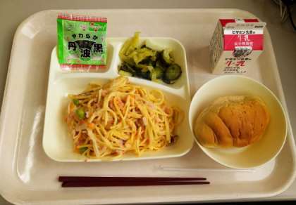 今日の給食のメニューは、さけのクリームスパゲティー、キャベツときゅうりのサラダ、ソフト黒豆、黒糖パン(小)、牛乳でした。
