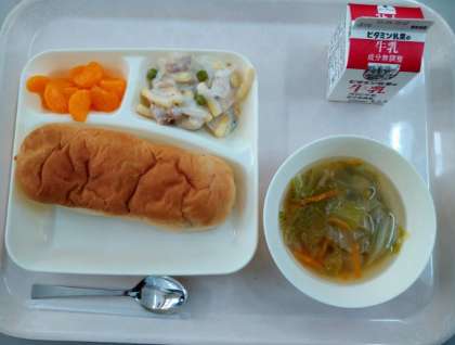 今年度最初の給食は、マカロニグラタン、レタスのスープ、みかん(缶)、レーズンパン、牛乳でした。グラタンという名前は、フランス語の「焼き色をつけて調理する」や「グラッテ(こそげとる)」という言葉からきたと言われています。焼き色をつけたり、こげたところをこそげとったりすることから名付けられた料理です。