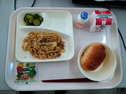 本日は、焼きそば、きゅうりののしょうゆがけ、豆こんぶ、発酵乳、黒糖パン(小)、牛乳でした。
