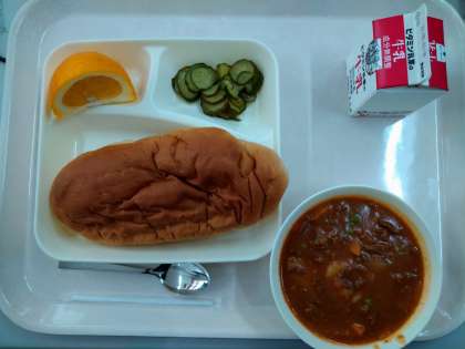 今日の給食のメニューは、ビーフシチュー、きゅうりのサラダ、あまなつみかん、黒糖パン、牛乳です。