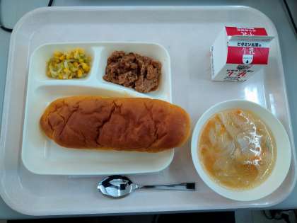 今日の給食は、豚肉のデミグラスソース、スープ、キャベツとコーンのソテー、パンプキンパン、牛乳でした。