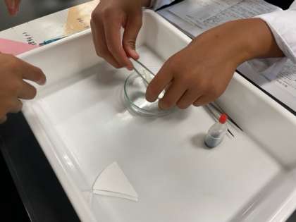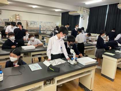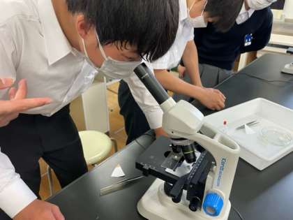 2年生の理科で、タマネギを用いた、植物の細胞を観察しています。酢酸オルセイン溶液を用いて、核が赤く染まってるのを、顕微鏡を用いて上手に観察実験できています。