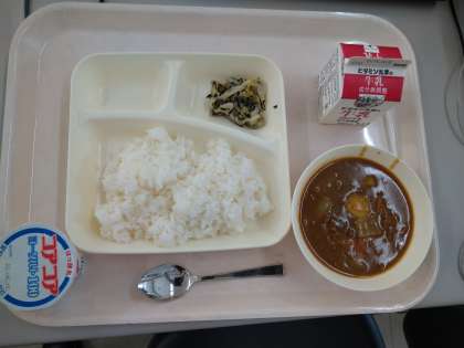 本日のメニューは、牛肉と大豆のカレーライス、キャベツのひじきドレッシング、ヨーグルト、牛乳でした。