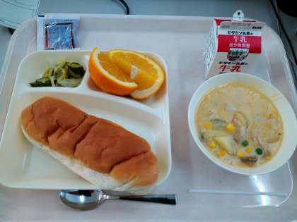 今日は、コーンクリームシチュー、キャベツときゅうりのサラダ、河内ばんかん、コッペパン、いちごジャム、牛乳でした。