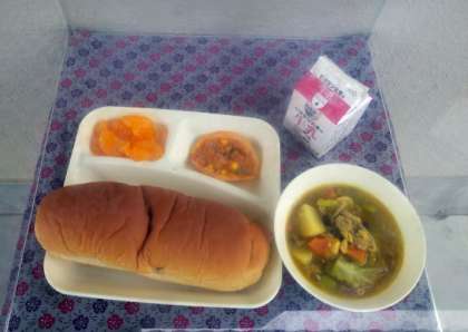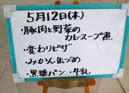 本日は、豚肉と野菜のカレースープ煮、変わりピザ、みかん(缶)、黒糖パン、牛乳でした。美味しく頂きました。ごちそうさまでした。