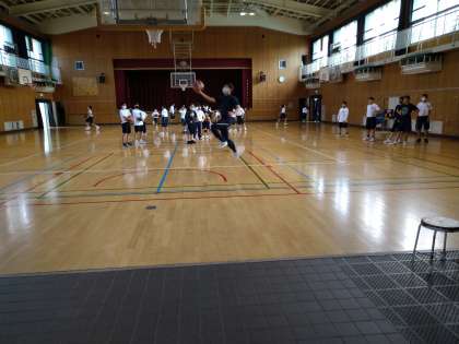 体育館では、交替でバスケットボール部が活動をしています。シュート練習をしていました。きれいなフォームでシュートしていました。先生も手本としてプレーをしています。
