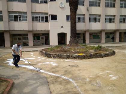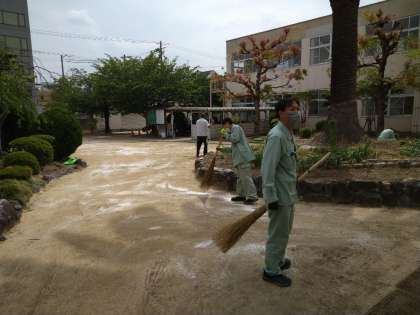 今日の午後から、数名の先生方で中庭のにがり撒きをしていただきました。砂埃の心配がなくなりました。ありがとうございます!