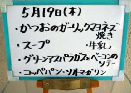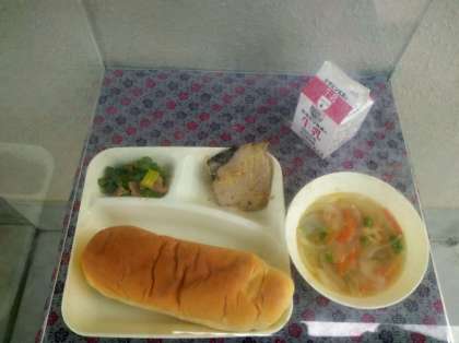 今日は、かつおのガーリックマヨネーズ焼き、スープ、グリーンアスパラガスとベーコンのソテー、コッペパン、ソフトマーガリン、牛乳でした。