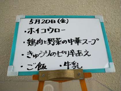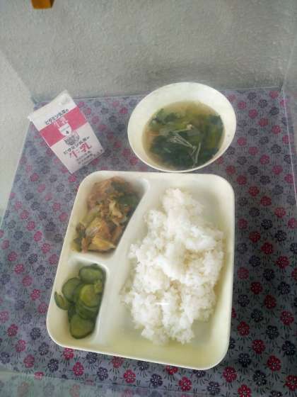 本日のメニューは、ホイコウロー、鶏肉と野菜の中華スープ、きゅうりのピリ辛味あえ、ごはん、牛乳でした。