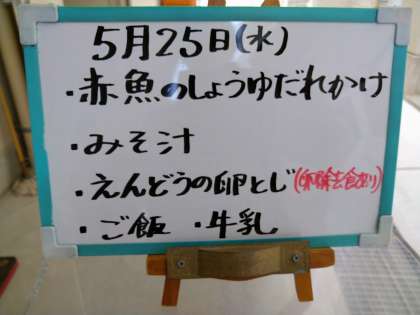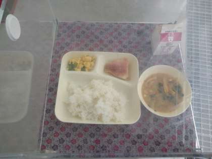 今日の給食のメニューは、赤魚のしょうゆだれかけ、みそ汁、えんどうの卵とじ、ごはん、牛乳でした。