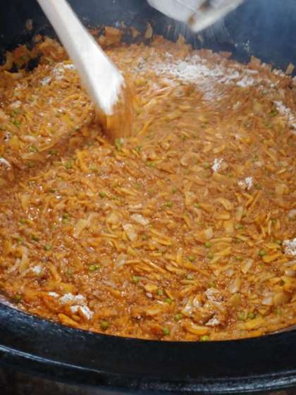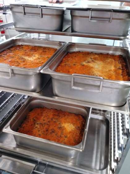 11時頃、給食室から良いにおいがしてきました。ちょうどグラタンの材料を煮あげたところです。これから味付けして小麦粉を振り入れます。出来上がったグラタンのタネはクラスごとのバットに計り入れ、パン粉を振って焼き物機で焼き上げます。約20分後、良いにおいとともに、きれいな焼き色のグラタンが出来上がりました。焼き目が香ばしく、食欲がそそられます。