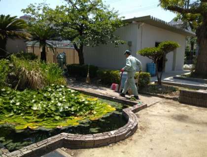 今日も暑い中、管理作業員の方々が校庭の清掃をしてくださっています。