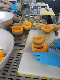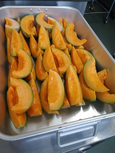 今日は、かぼちゃのクリームシチューとさわやかなゆず風味のドレッシングであえたキャベツのゆずドレッシング、クインシーメロン、パン、牛乳の組み合わせです。
